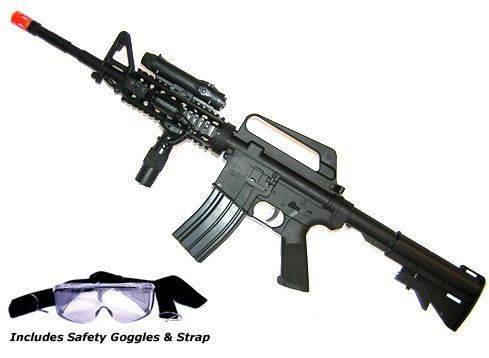 Description This airsoft rifle is great for the beginner. Very close in form and function to the real steel 16-A4, this inexpensive airsoft rifle will provide hours of enjoyment. This version features an extendable stock, LED illuminator light. With this M-16A4 replica, the admiration continues in the sports realm of AirSoft. 240-290 fps. 65 Round capacity.